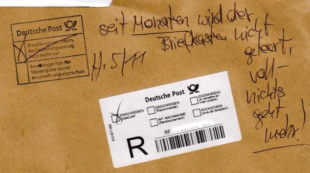 8. November 2009 Kai Siegfried Wirklich voll! Nichts geht mehr! Mit ungewöhnlich viel Verve weist die Post auf die Unzustellbarkeit hin. Nachtrag: Und der dazu passenden Mail „Ihre Sendung RF(….)DE wurde am 07.11.2009 zugestellt.“ kann ich nicht wirklich glauben.